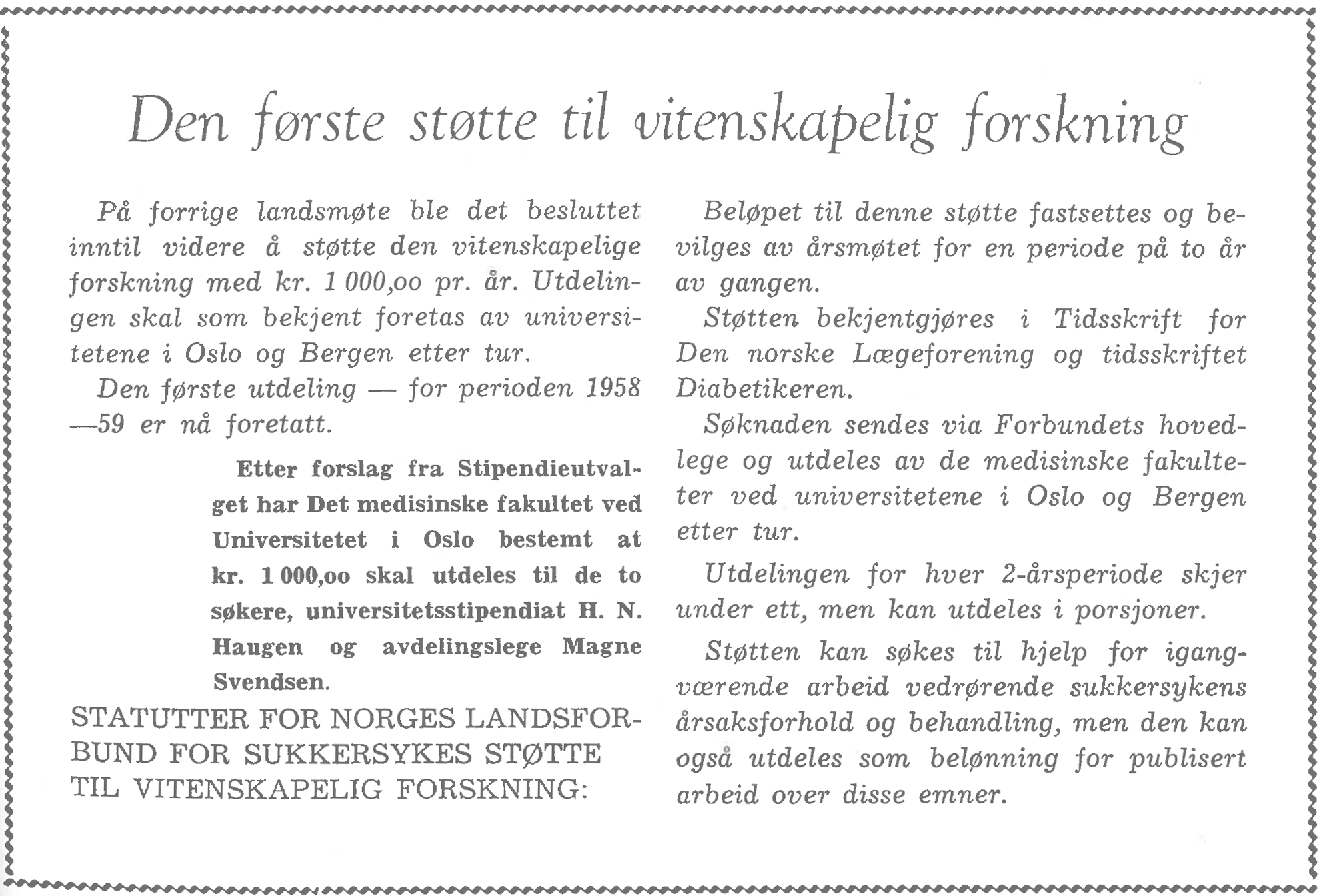 I 1960 delte Diabetesforbundet ut de første midlene til forskning. Da kunne medlemmene lese i tidsskriftet Diabetikeren: På forrige landsmøte ble det besluttet å støtte den vitenskapelige forskningen med kr 1000 per år.