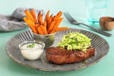 Biff med søtpotetchips og squash