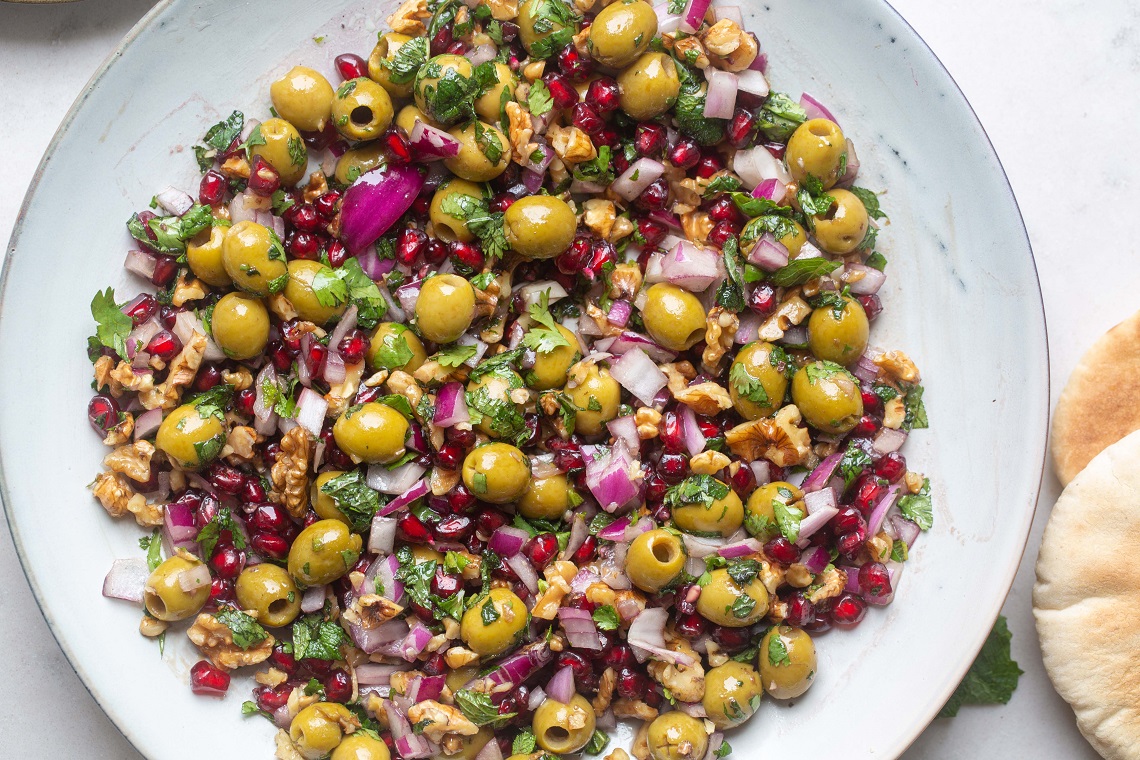 Oliven, granateple og valnøttsalat