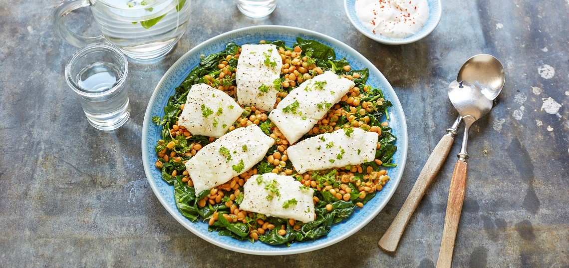 Ovnsbakt hyse med linser og spinat