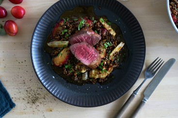 Reinsdyrbiff med linser, jordskokk og plommer