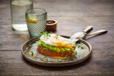 Smør skivene med dijonsennep og legg på salatblader. Del avokado og ta ut steinen. Ta innmaten ut av skallet med en skje og skjær det i skiver. Gi dem en liten dytt så de legger seg i en pen vifteform og legg dem på brødskivene.