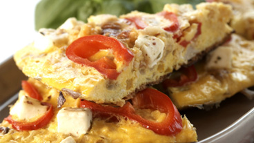 Fres løk og paprika lett i litt margarin eller smør til det blir mykt. Hell eggblandingen over og ha i resten av ingrediensene til frittataen og sett på lokk.