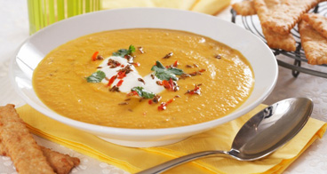 Kjør suppen i en hurtigmikser eller med en stavmikser til den er jevn og glatt. Smak til suppen med salt og pepper.Server suppen med finhakket koriander, yoghurt naturell og blandingen med chili og spisskumfrø.