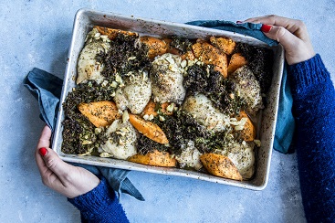 Plasser formen midt i ovnen på 200 °C og stek i 20-25 minutter til kyllingbitene er gjennomstekt og søtpoteten har fått fin, gyllen farge. Grønnkålen kan bli litt mørk i kantene.