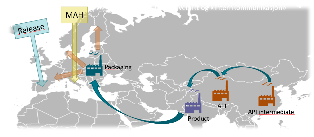 Under et tankevekkende foredrag på Arendalsuka viste han illustrasjonen som gir grunn til bekymring: Medisinene våre delproduseres på flere forskjellige fabrikker, gjerne i Asia – før de sendes til Europa – gjerne Øst-Europa, for pakking.