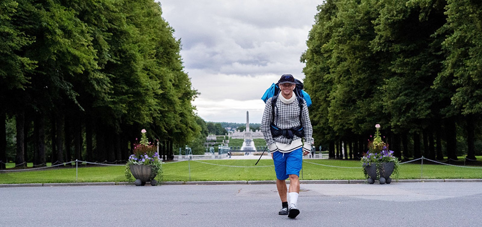 Vi møter 30-åringen på Aker brygge, tre dager etter at han ankom hovedstaden til fots. Etter å ha gått drøyt 46 mil på ti dager, er det godt å endelig kunne slappe av og nyte ferien. Pizzaen på uterestauranten går ned på høykant, der han sitter sammen med brødrene sine, Sondre og Erlend.