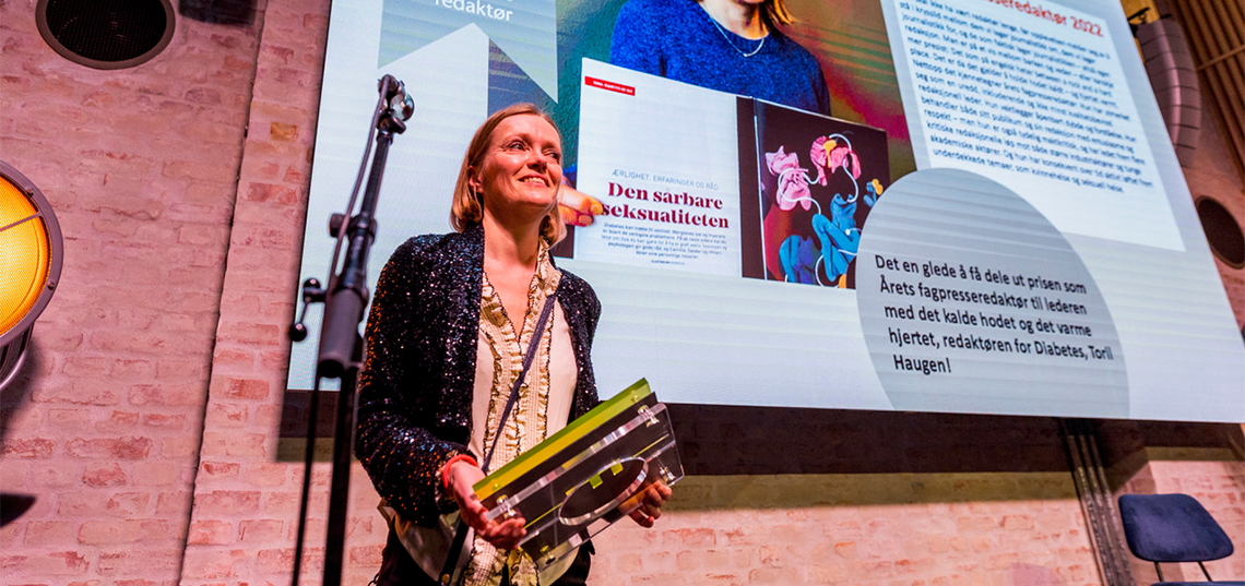 Toril Haugen kunne ta med seg enda en pris hjem etter utdelingen. Hun ble også kåret til årets redaktør for sitt arbeid med bladet Diabetes. «Hun har utmerket seg som en uredd, inkluderende og ikke minst kvalitetsbevisst redaksjonell leder», skriver juryen (les hele begrunnelsen sist i artikkelen). Haugen selv er glad for at arbeidet hun har gjort med Diabetes de siste årene, blir lagt merke til.