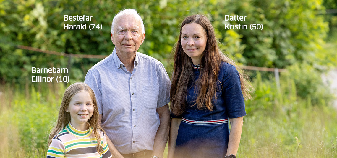 Sola skinner over Fyllingsdalen utenfor Bergen. Hjemme hos Kristin Bergitte Hauge er tre generasjoner samlet: Kristins far, Harald, Kristin selv og hennes datter Ellinor.