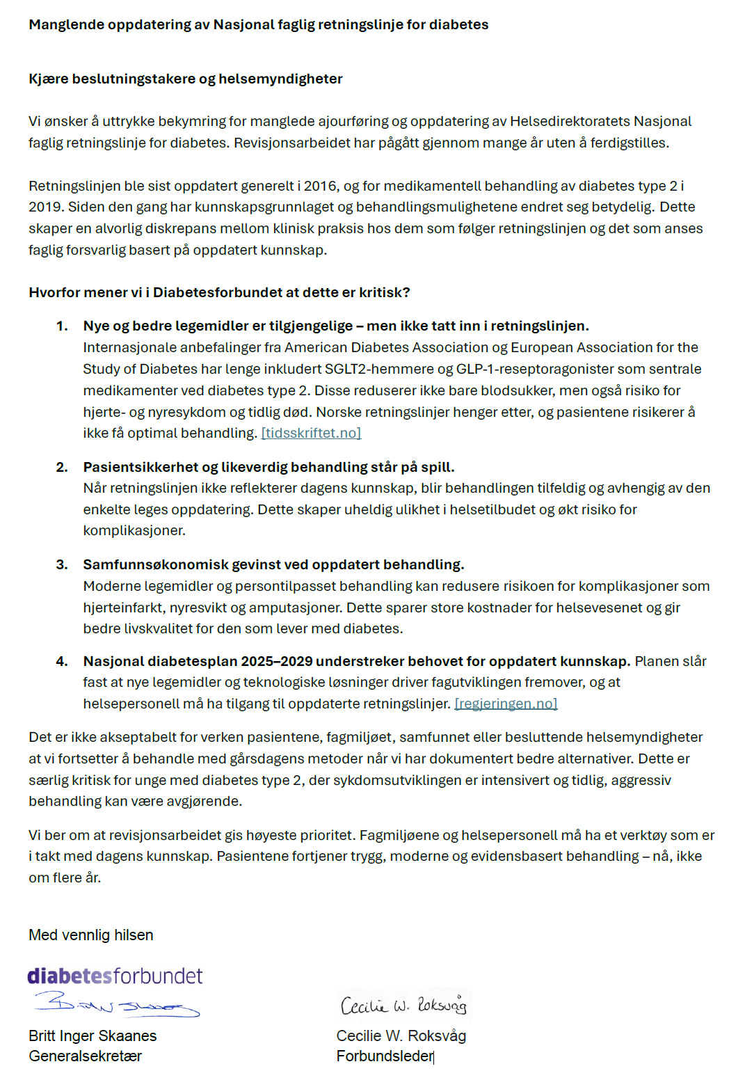 Helse- og omsorgsdepartementet har svart på forbundets henvendelse. De henviser til Helsedirektoratet, som har ansvar for å utarbeide og revidere nasjonalfaglige retningslinjer. Videre peker departementet på ny nasjonal diabetesplan for 2025-2029, der ett av tiltakene er å oppdatere retningslinjene.