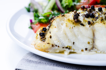 • Steinbit med tomatsaus, salat og fullkornspasta