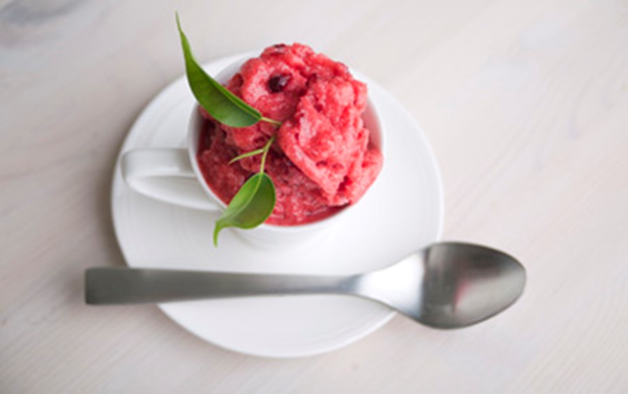 Bland bær, melis og kesam i en kjøkkenmaskin eller blender. La maskinen gå til alt er godt blandet. Kan serveres med én gang, men da blir isen mer som softis.