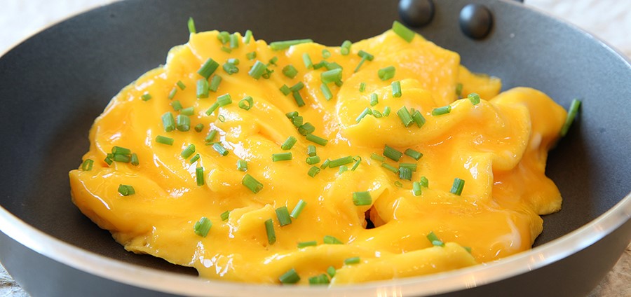 Skru av varmen og la eggerøra steke ferdig på ettervarmen fra stekepannen. Eggerøra fortsetter å steke/koagulere etter du har tatt den av stekepannen til