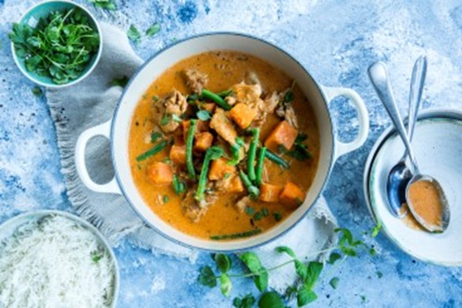 Kutt søtpotet i biter på størrelse med kyllingbitene og ha dem i gryten. Kok videre i ca. 10 minutter, til søtpotetene er møre. Rør om av og til. Smak til med salt og pepper.