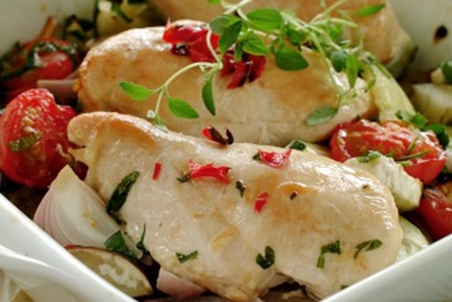 Del grønnsakene i passe biter og legg dem i en ildfast form sammen med kyllingfilet. Hell over olje og dryss på krydder, salt og pepper.