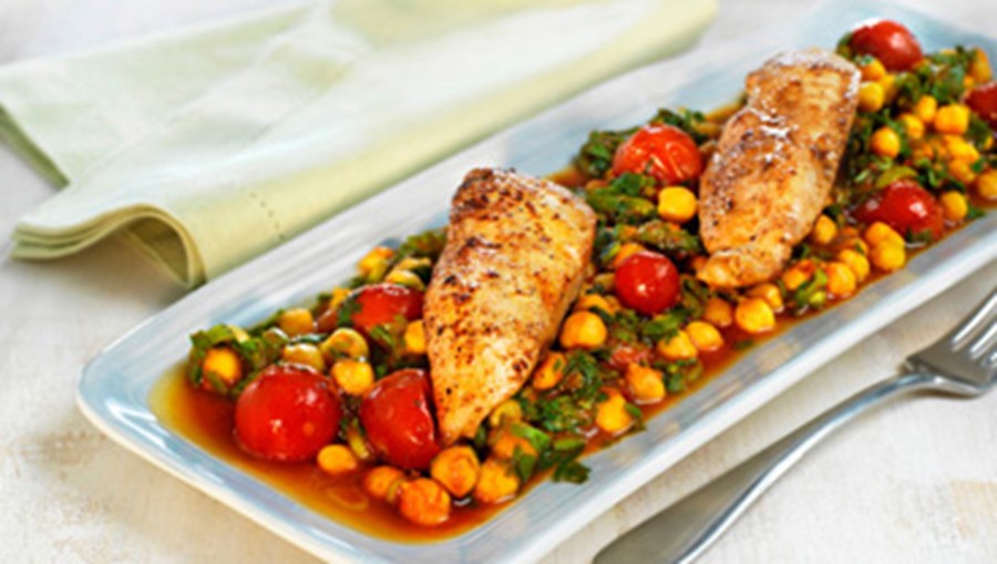 Ha tomater og kikerter i en ildfast form, og bland i krydder og hvitløk. Sett formen i ovnen på 225 °C og stek i 20 minutter.