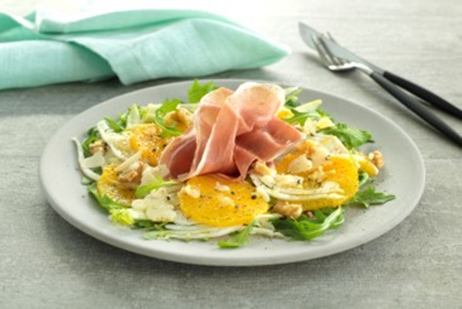 Fordel ruccola på tallerkener og legg appelsinskiver og fennikel oppå. Legg spekeskinken på toppen. Dryss over valnøttkjerner, parmesan, kvernet pepper og salt. Drypp over litt god olivenolje til slutt.