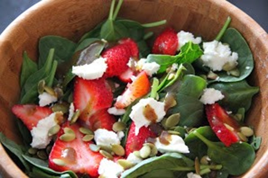 Bland spinat og jordbær, strø over gresskarfrø og chevre, og drypp dressingen over hele salaten.