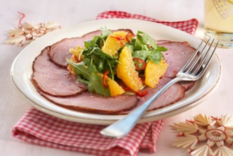 Legg skinkeskivene utover et fat og ha over salatblandingen eller legg litt appelsinsalat på en og en skinkeskive , brett rundt og fest med en tannpirker. Server på koldtbord med andre småretter.