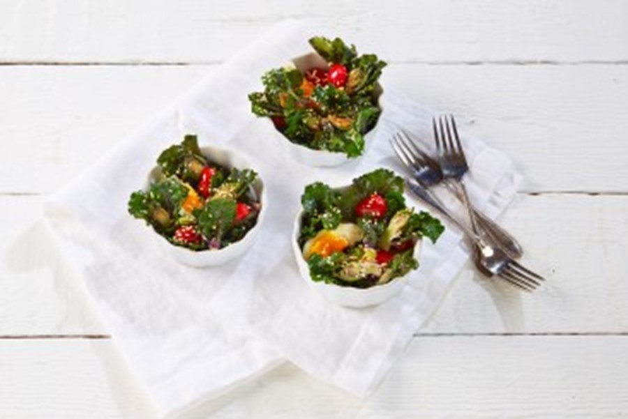 Dander alt i 4 porsjonsskåler. Ha over noen dråper med olivenolje og balsamicoeddik og dryss sesamfrø på toppen.