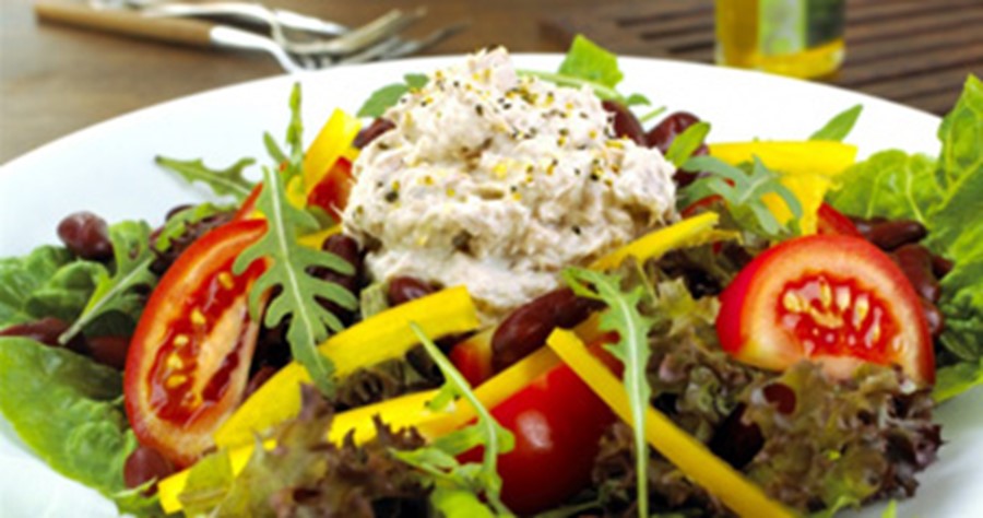 Salatingrediensene fordeles på tallerkener og toppes med tunfiskblandingen.