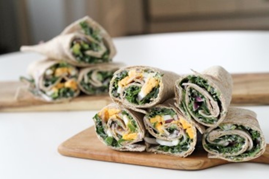 Smør tortillalefsene med wasabikremen og fyll med kuttet grønnkål og løk. Legg egg og kyllingskinke på toppen. Rull lefsene fast sammen. Pakk de inn i aluminiumsfolie eller annet og ta dem med i sekken.