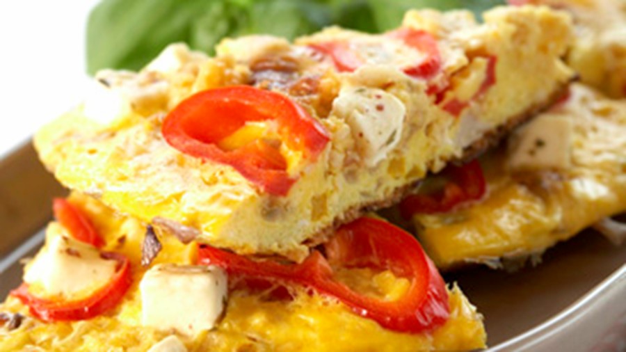 Fres løk og paprika lett i litt margarin eller smør til det blir mykt. Hell eggblandingen over og ha i resten av ingrediensene til frittataen og sett på lokk.