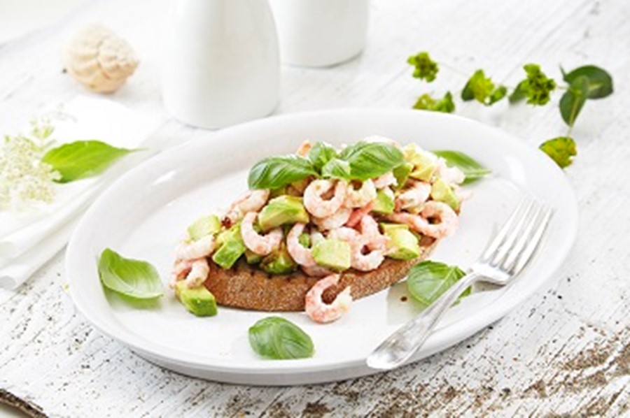 Ha reker og avokado på brødet, og drypp over olivenolje og balsamicoeddik.