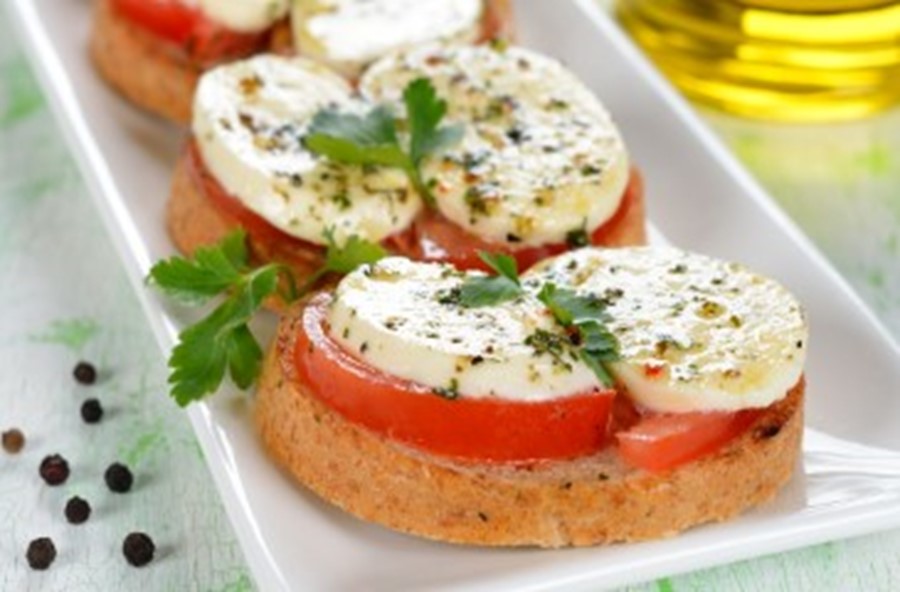 Skjær mozzarella og tomat i skiver.