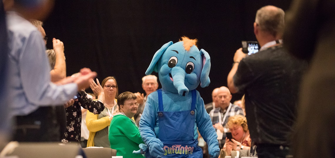 Landsmøtet var den perfekte arena for lanseringen av Insufanten, som nå skal brukes for alt den er verdt i arbeidet med å skape oppmerksomhet om barnediabetes. Med avtroppende sentralstyremedlem Marlon Hepsø inne i drakten gikk han sin triumfferd ned midtgangen i landsmøtesalen, og opp på scenen til trampeklapp.