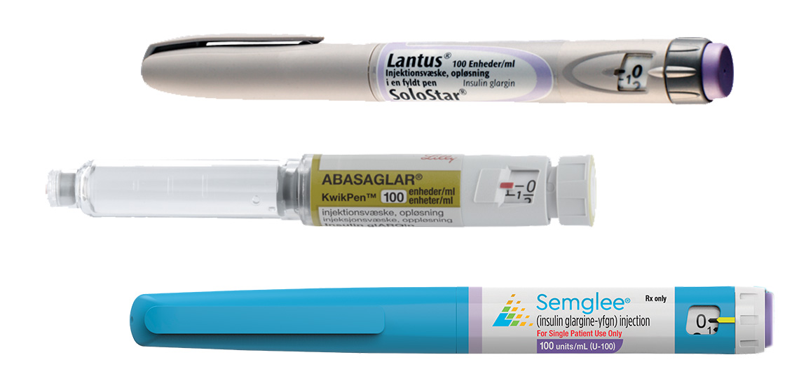Langtidsvirkende insulin glargin kjenner du som merkene Abasaglar, Lantus og Semglee (utgått 2025). De har en virkningstid på ca. 24 timer og settes én gang i døgnet. Middels langtidsvirkende NPH-insulin som du kjenner som Insulatard og Humulin, virker vanligvis i ca 12 timer.