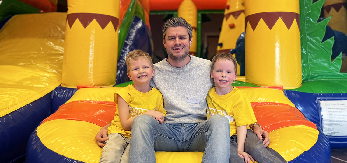 – Vi er her for første gang, og det har vært fint. Jeg er positivt overrasket over at det er så mye for oss voksne, sier Fredrik Falck, som vi møter ved hoppeslottet, der sønnene Magnus og Oskar (5) svetter ut energi. Guttene er toeggede tvillinger. Bare Magnus har diabetes.